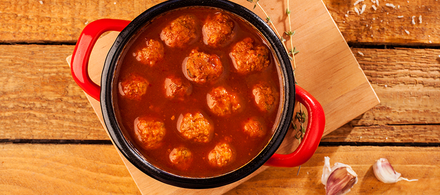 Mezcla la carne picada con el jamón curado, el huevo batido, el pan rallado, un poco de leche, el perejil y el ajo picado. Salpimienta y amasa a mano hasta conseguir una masa homogénea. Pon en una cazuela a calentar el aceite. Pasa las albóndigas por harina y fríelas. Una vez hechas las albóndigas. Añade a la cazuela la salsa de tomate (rectifícala con un poquito de azúcar) y una vez este caliente añade las albóndigas. Déjalo cocer todo durante 10 minutos.