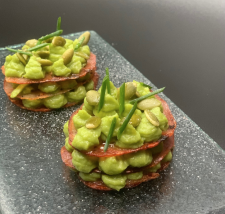 Milhojas de pavo crujiente con cremoso de aguacate y pipas de calabaza