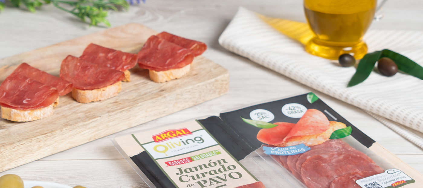 2. Proteínas de origen animal o vegetal cocinadas o preparadas ya para su consumo. Ya listas para su consumo podemos utilizar jamón cocido extra, lomo embuchado o jamón curado de pavo. Es importante que el % cárnico sea alto, como en el caso de estos productos de Argal, para que así nos sirvan como fuente proteica.