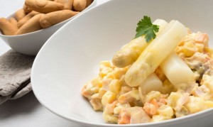 Ingredientes (4 personas): 250 gr. de pechuga de pavo Bonnatur de Argal. 2 patatas 1 boniato 8 espárragos blancos 4 huevos 12 filetes de anchoa en aceite 20 aceitunas verdes (sin hueso) 100 gr. de maíz picos de pan (para acompañar) agua aceite de oliva virgen extra vinagre sal perejil Elaboración de la receta de Ensaladilla de espárragos y pavo: Coloca en una cazuela las patatas, el boniato y 2 huevos. Sazona. Cuece los huevos durante 10 minutos. Las patatas y los boniatos durante…