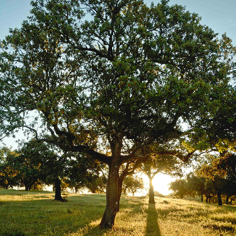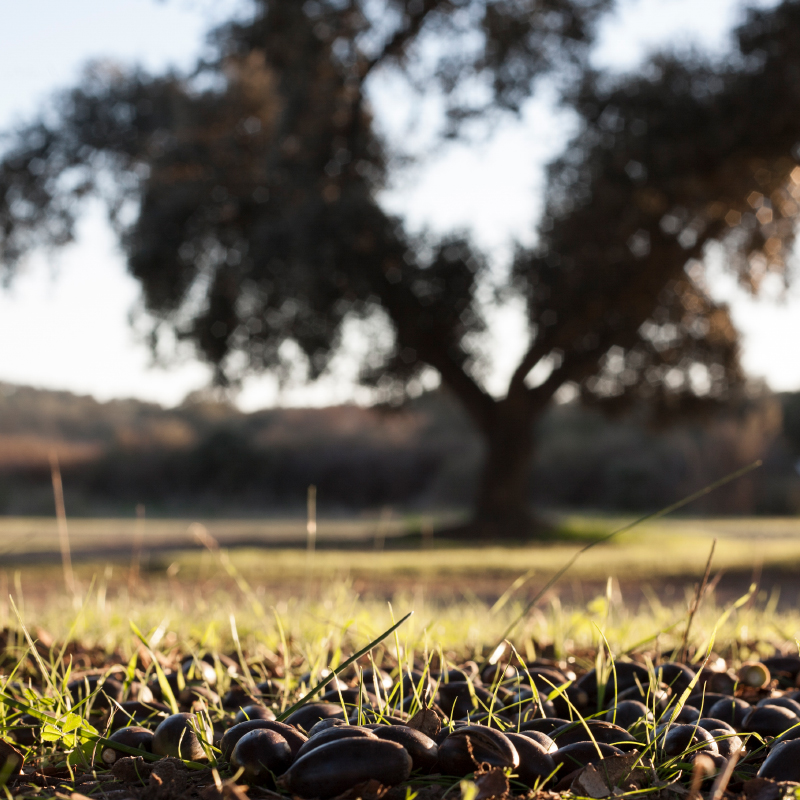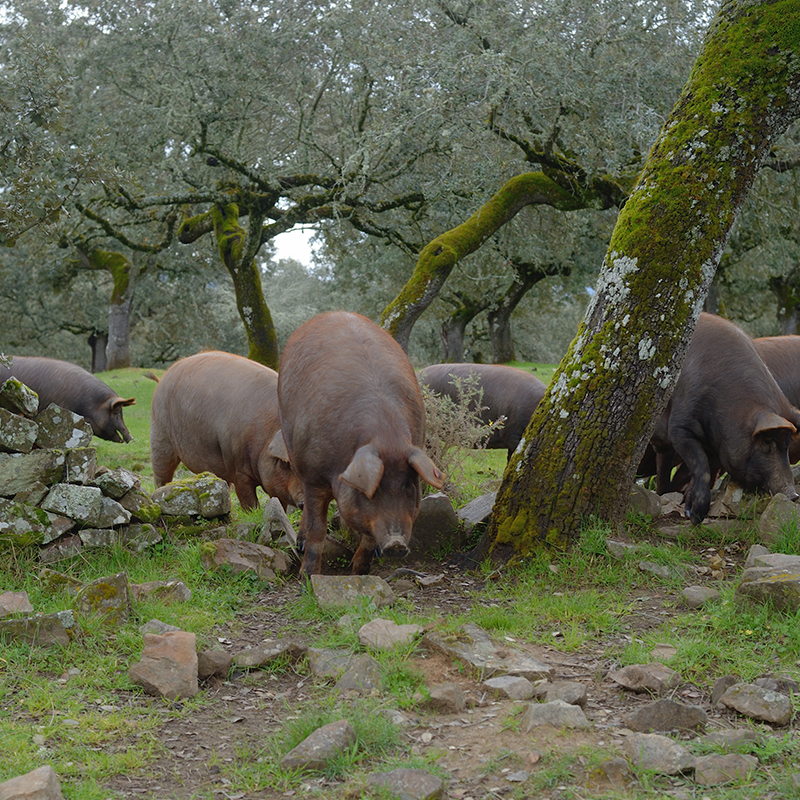 In the heart of the Extremaduran Dehesa lies a village abounding with tradition. Here Ibérico pigs are reared and fed not only on acorns and pasture, but also on air, sun, clouds, mountains... This accounts for their Ibérico nature, unique and unmistakable.